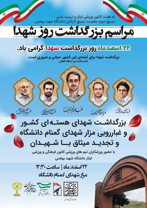 مراسم بزرگداشت روز شهدا، 22 اسفندماه 1402 در دانشگاه شهید بهشتی برگزار میشود.